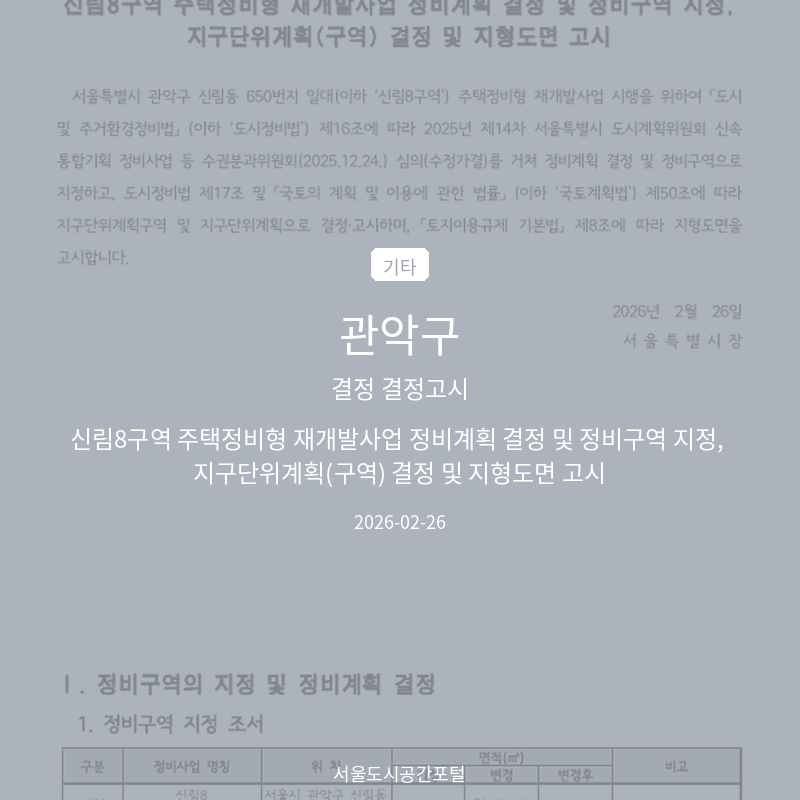 [관악구] 신림8구역 주택정비형 재개발사업 정비계획 결정 및 정비구역 지정, 지구단위계획(구역)… (2026-02-26)